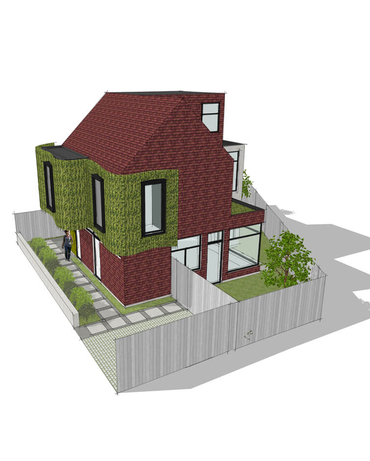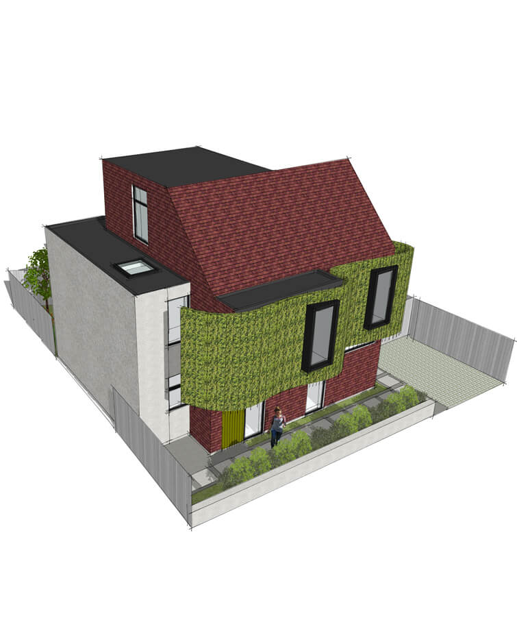 The existing garage was replaced by a new single-storey building which accommodates a gym space with separate service rooms. This also has strong connections to the rear garden. This building has a distinct wedge shape which softens the transition of scale between itself and the main house. It is clad with stained black Russian Redwood to provide a distinct monolithic architecture.