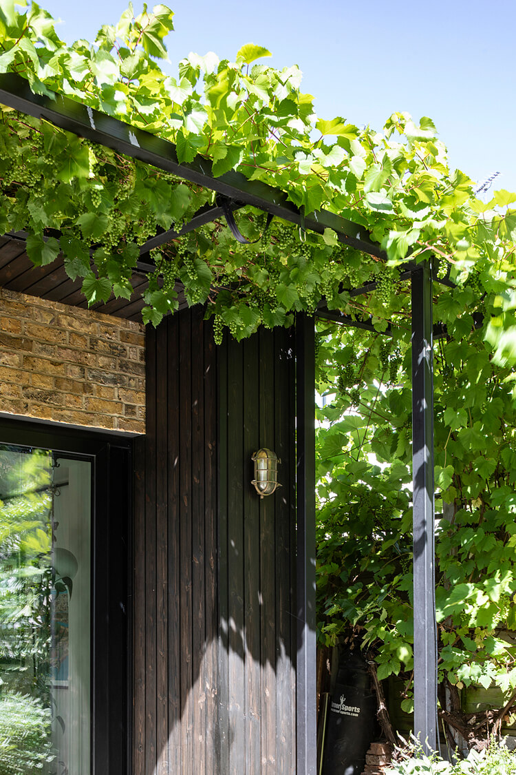 The existing garage was replaced by a new single-storey building which accommodates a gym space with separate service rooms. This also has strong connections to the rear garden. This building has a distinct wedge shape which softens the transition of scale between itself and the main house. It is clad with stained black Russian Redwood to provide a distinct monolithic architecture.